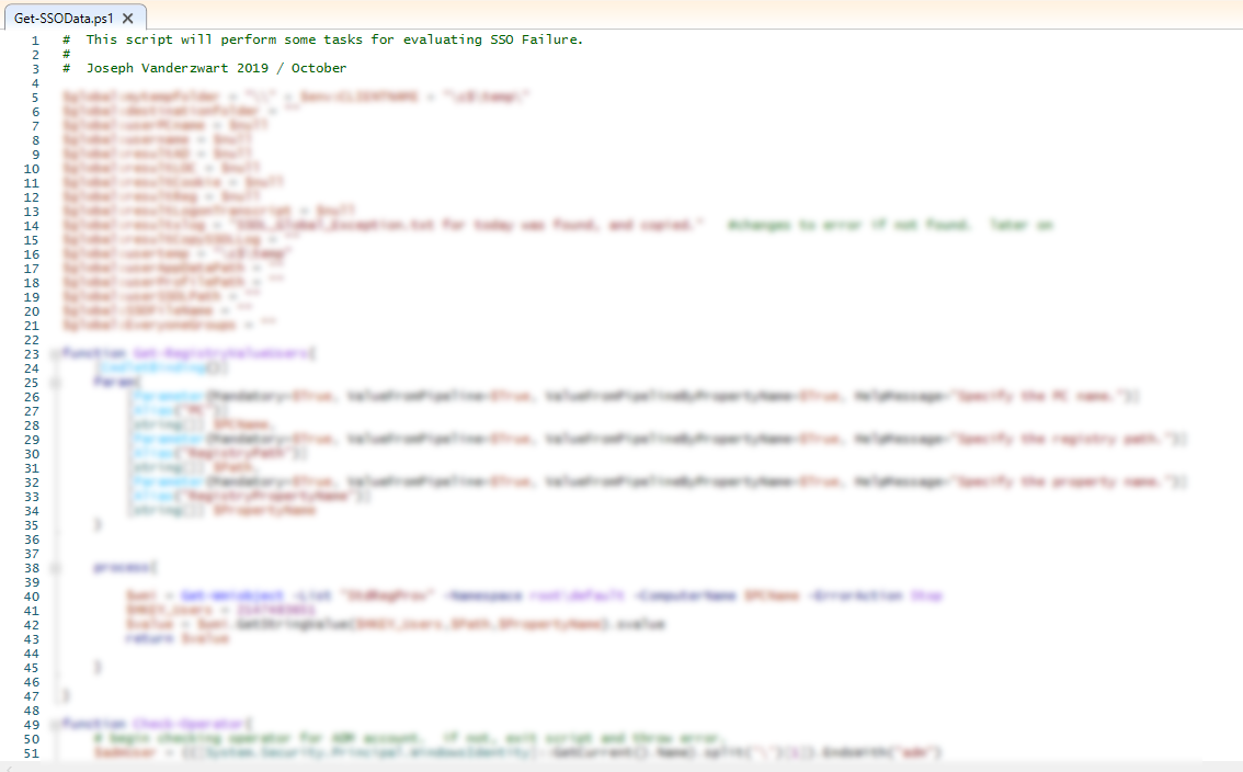 This Powershell Script was developed to evaluate software failures in a corporate environment. The script queries Active Directory, Windows Environment Variables, Local Registry Values, and copies files. This script facilitates speedy troubleshooting and diagnosis of an ongoing problem in our environment.